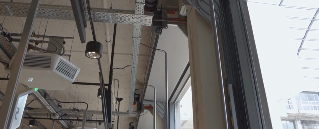 The Compact door operates with a unique folding system whereby the door panels fold up above the doorway. This eliminates the need for ceiling rails and leaves the ceiling completely free for installations and structures. This makes the Compact door particularly suitable for buildings with complex or full ceilings.